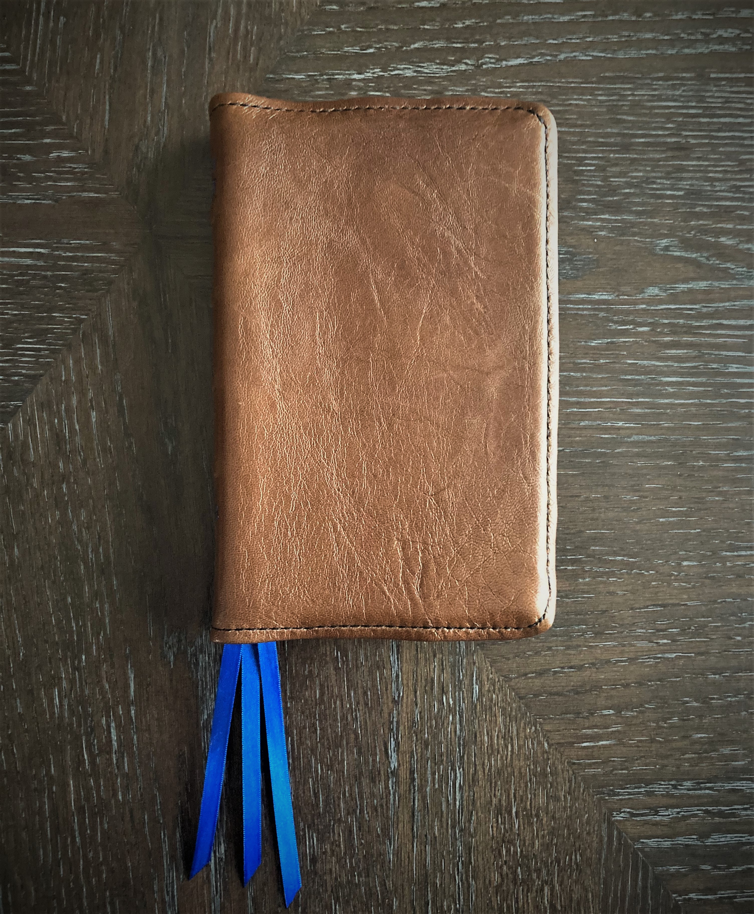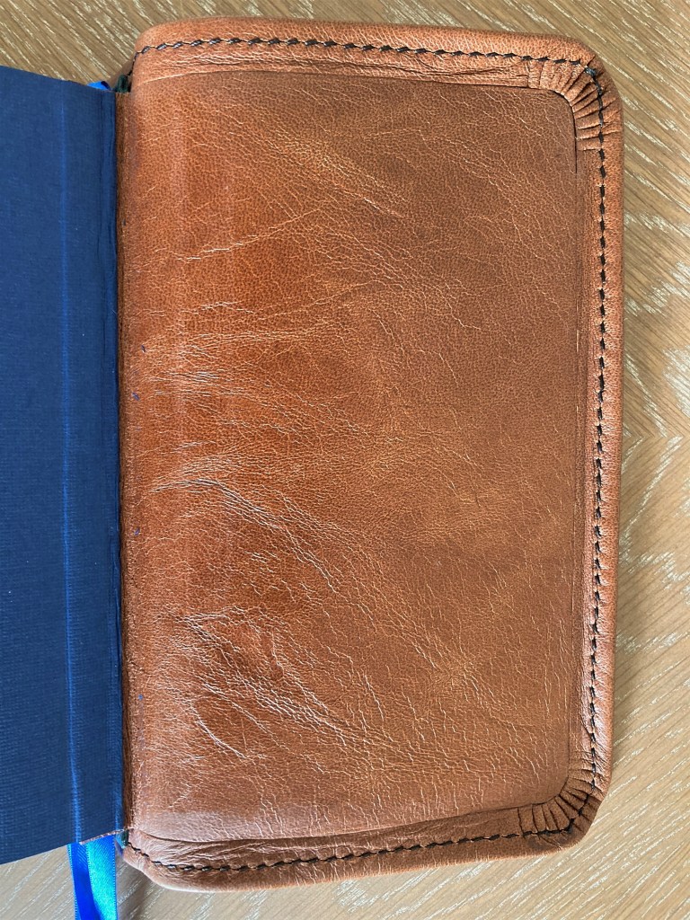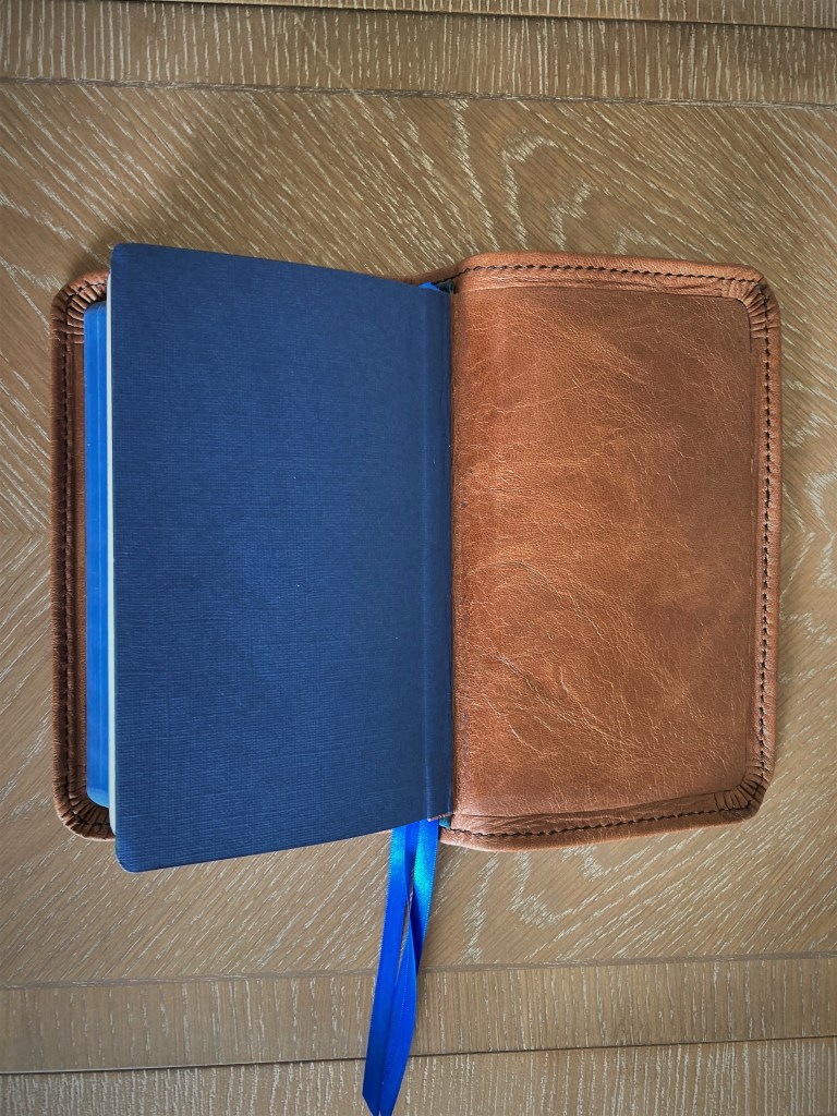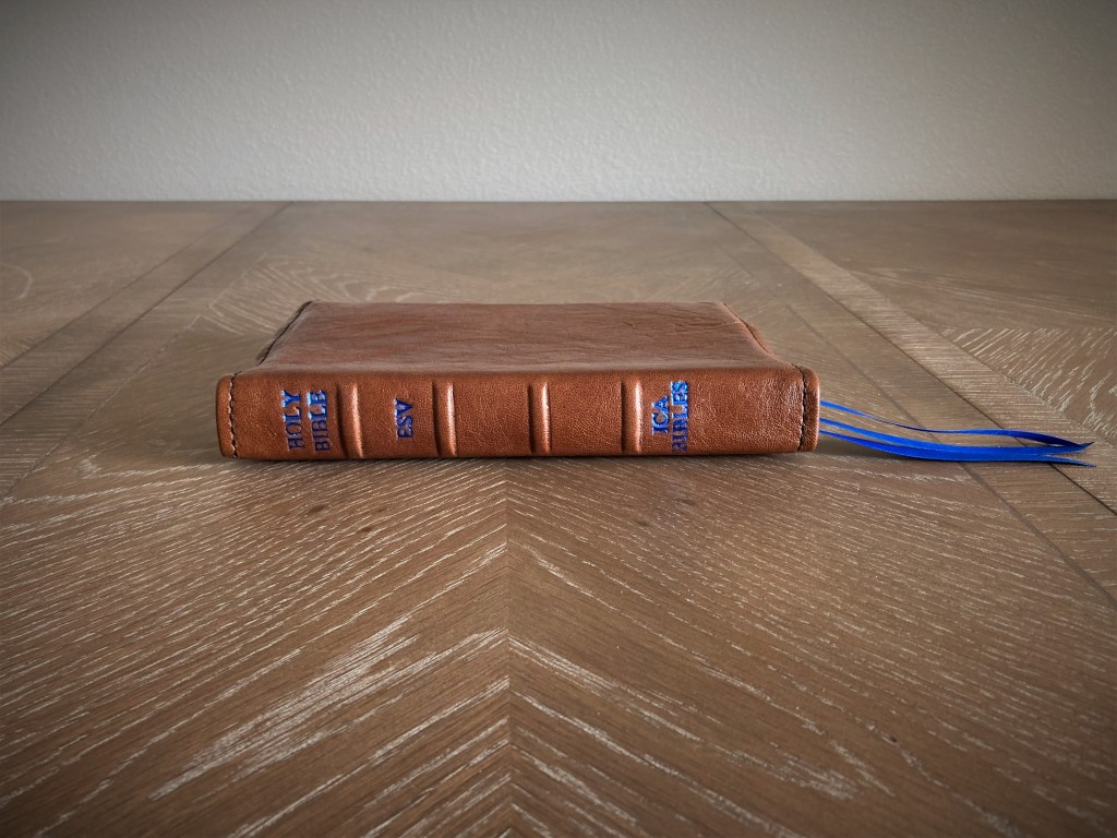ESV Large Print Bible: Brown Antique Rustic Italian Lambskin Cover/Liner – Hand Stitched – Blue Page Dye – 5.5″ X 8.5″ $195