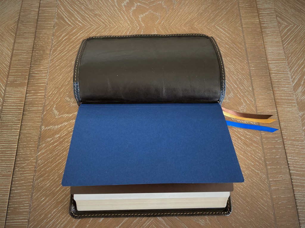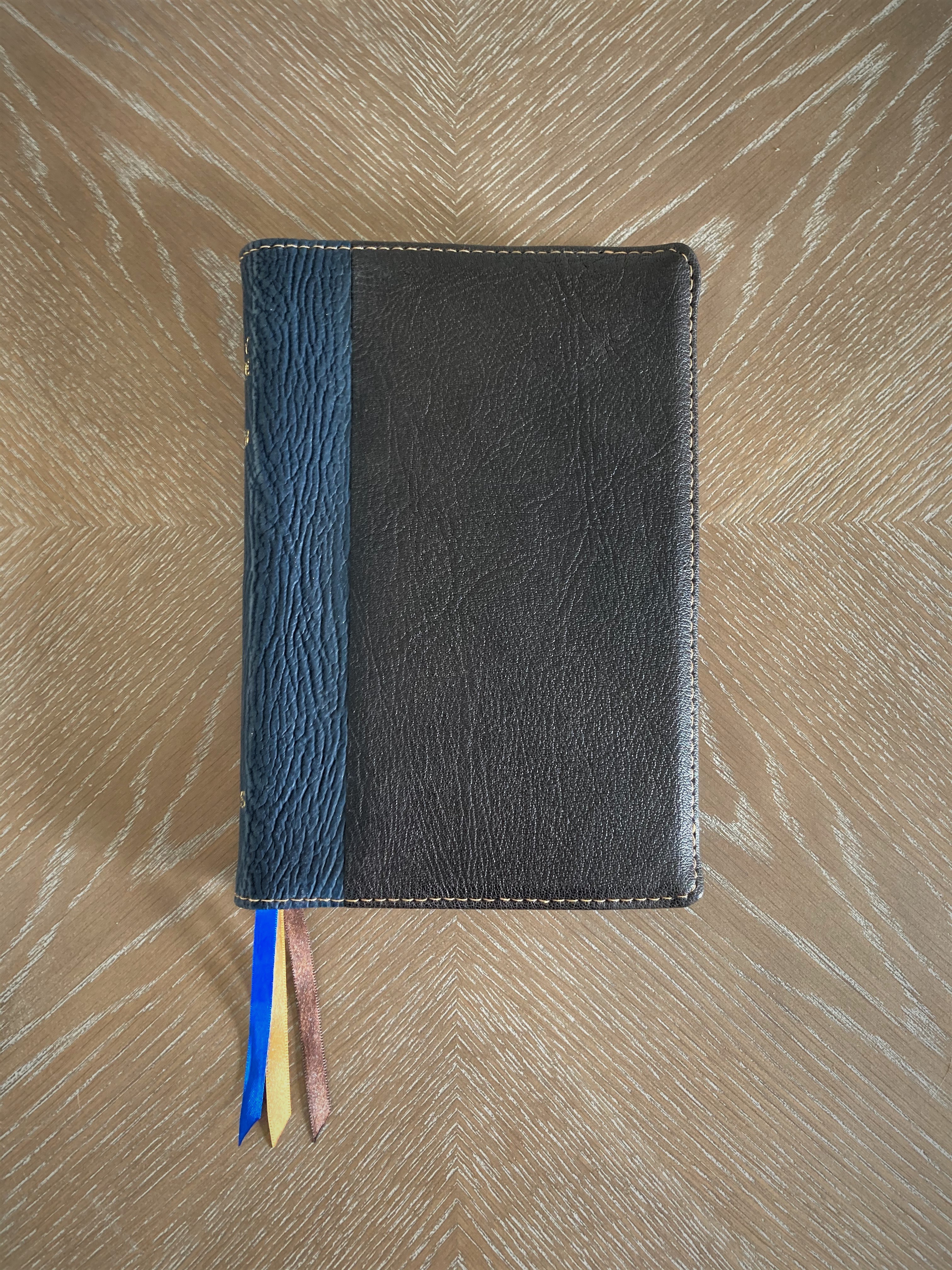 NASB Comfort Print Preachers Bible: Mocha Sokoto Goatskin/Deep Blue Sharkskin Cover – Black Pebble Grain Italian Lambskin Liner – Hand Stitched – 3 Piece Cover – 6″ X 9″ X 1″