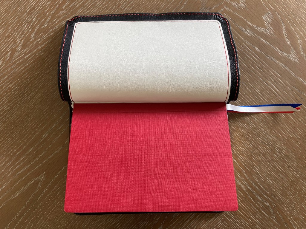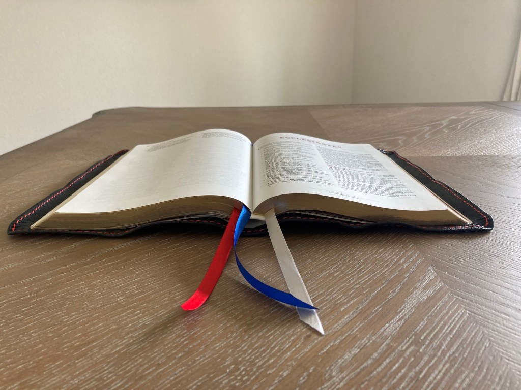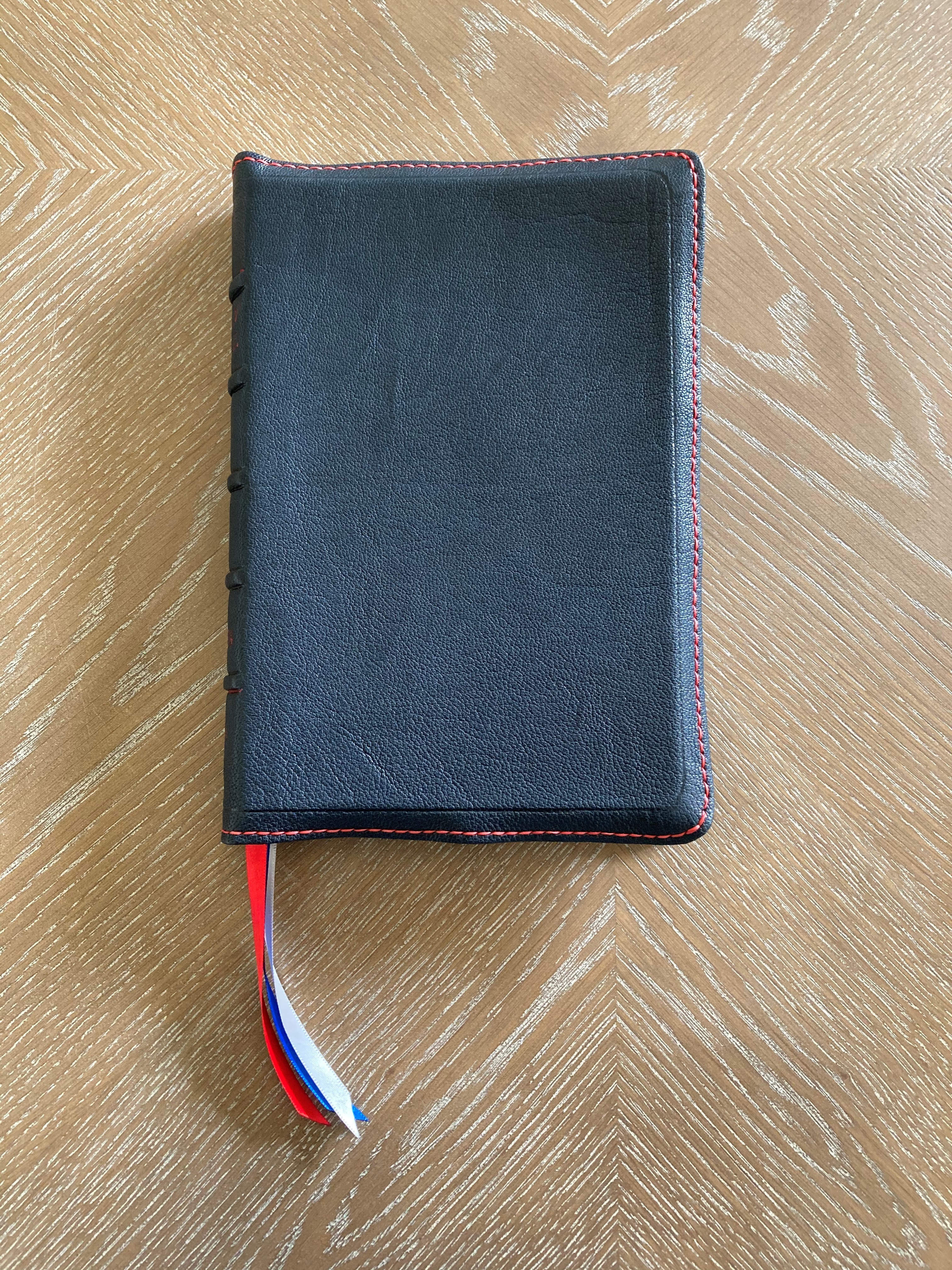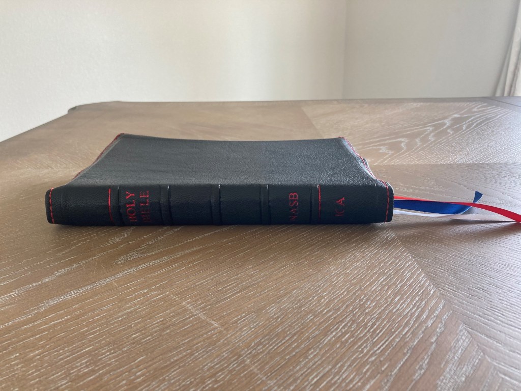NASB Comfort Print Preachers Bible: Navy Blue Roma Goatskin Cover – White Smooth Lambskin Liner – Hand Stitched/Gilt Line – 6″ X 9″ X 1″- $240 – SOLD